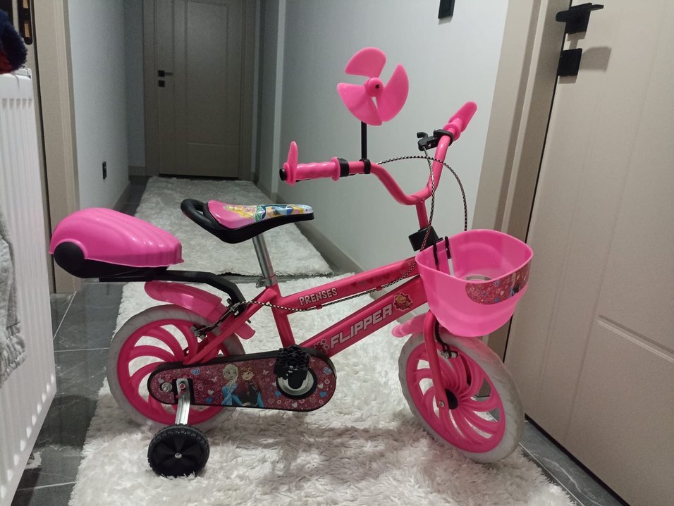 Önde sepet, destek tekerlekleri ve gidonda dekoratif rüzgar gülü bulunan pembe üç tekerlekli bisiklet. Renkli detaylar ve prenses teması içerir.