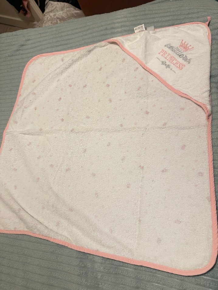 Pastel pembe renkte, yumuşak ve sıcak kumaştan yapılmış, desenli ve köşesi prenses işlemeli kapüşonlu bebek battaniyesi.