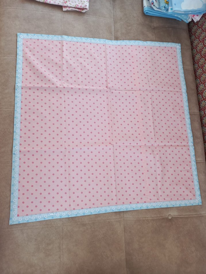 Pastel pembe renkte, puantiyeli ve açık mavi kenarlıklı çocuk battaniyesi. Yumuşak sentetik kumaştan üretilmiştir. ️