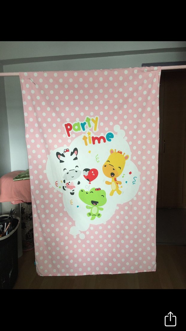 Pembe puantiyeli çocuk battaniyesi, yumuşak kumaş üzerine renkli çizgi film hayvanları ve "party time" yazısı içerir. Kullanılmış defolu