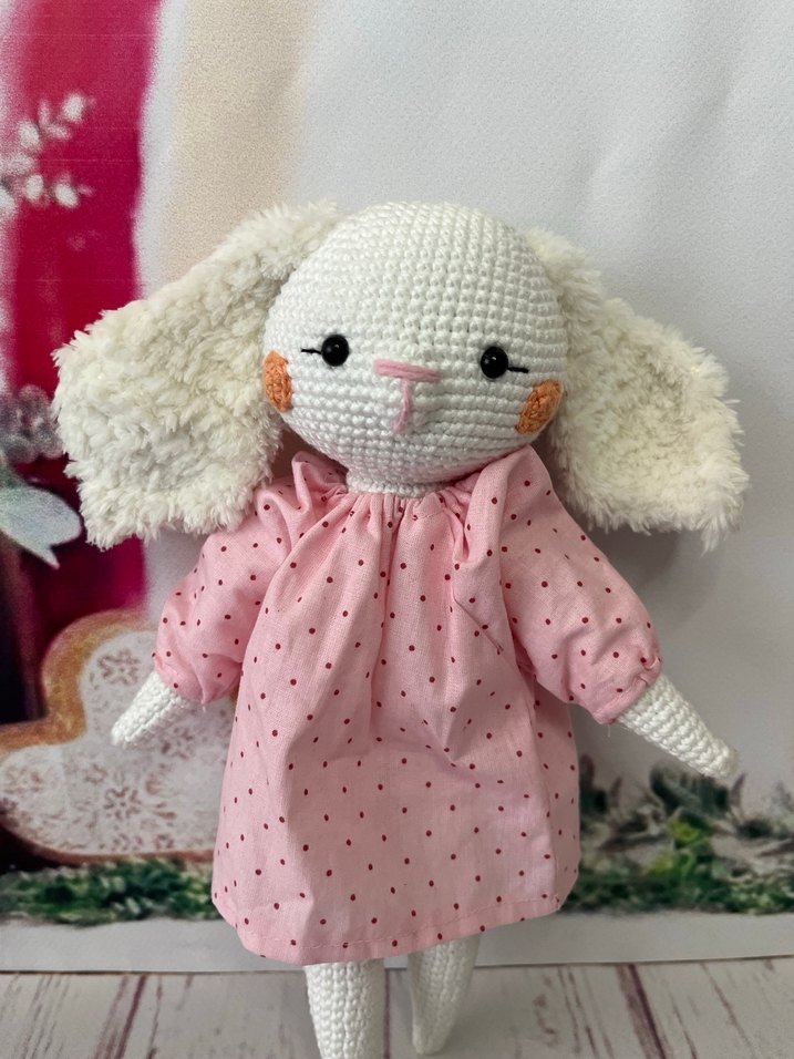 Pembe puantiyeli el örgüsü elbise giymiş, pastel pembe renkli peluş tavşan. Yumuşak, kabarık kulaklara ve işleme yüz detaylarına sahip.