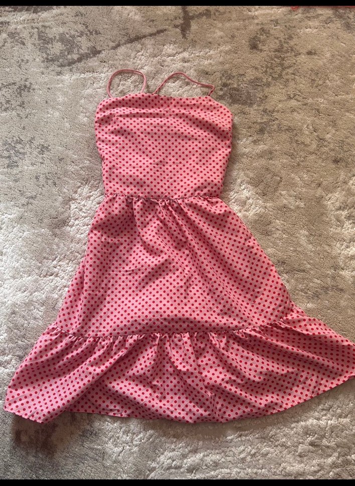 Pembe puantiyeli, askılı fırfırlı uzun-midi elbise Sadece bir kez giydim