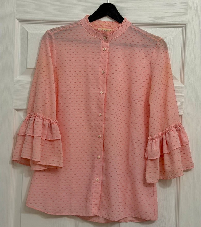 Pembe renkte, yüksek yakalı ve uzun kollu, fırfır detaylı bohem tarzda bol kesim bluz. Hafif puantiyeli ve yumuşak sentetik kumaştan yapılmıştır.