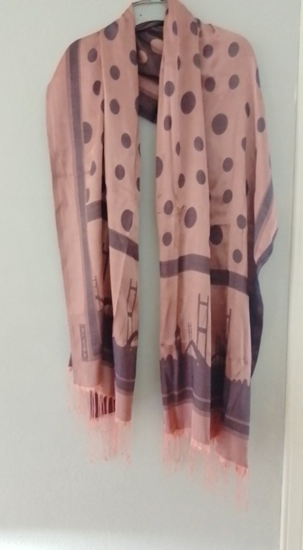 Kadınlar için pastel pembe ve koyu puantiyeli, dökümlü tasarıma sahip bohem ve retro tarzda şal. Yumuşak sentetik kumaştan üretilmiş alvisa marka şal.