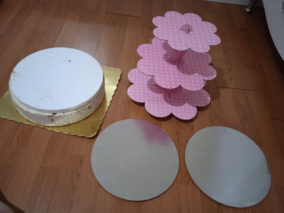 Pembe puantiyeli pastel tonlarda katlı kek standı ve yuvarlak altın renkli kek tabakları. Kek ve tatlı sunumu için uygundur. maket pasta straforu ve kek standı 1kere doğum gününde kullanıldı. yuvarlak pasta altıkları hiç kullanılmadı