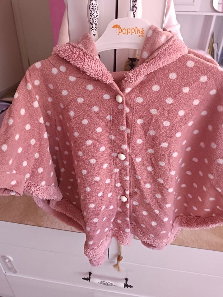 Pembe tonlarında, beyaz puantiyeli, düğmeli ve kısa kollu kız çocuk pançosu. Yumuşak ve sıcak kumaştan, bohem tarzda tasarlanmıştır.