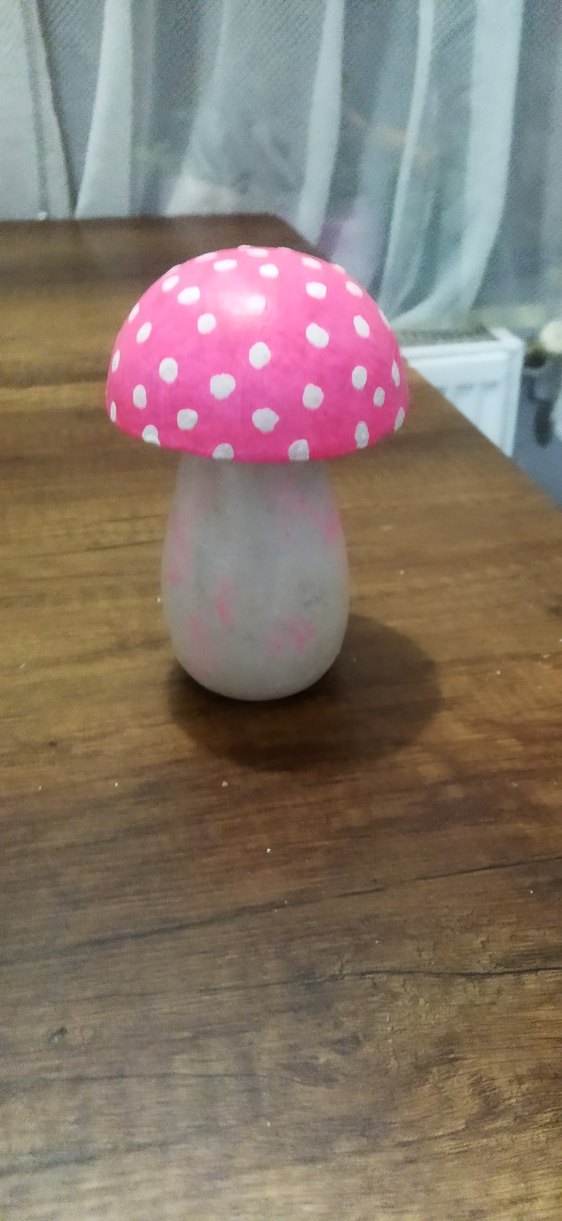Pembe puantiyeli mantar başlığı ve açık renk sapıyla dekorasyon için uygun bir figürin . Renk renk model model sipariş alınır