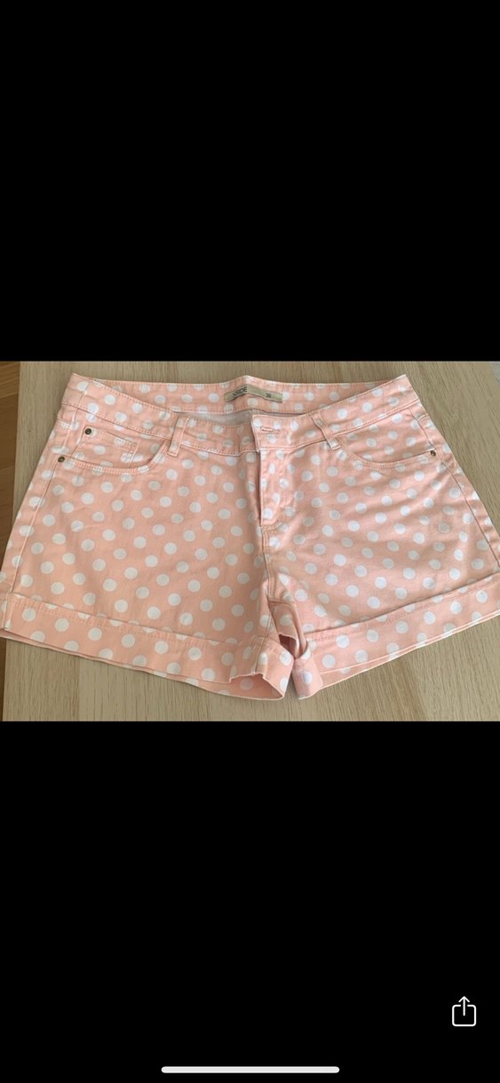 Yumuşak pamuk kumaştan, düğmeli, pembe puantiyeli, mini kadın şort. 57 kg a uygun.