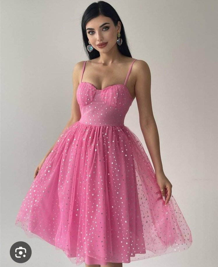 Pembe, ince askılı ve straplez kesimli bu elbise, parlak puantiyelerle süslenmiş dolgun etek ve vücuda oturan üst kısmı ile cesur ve gösterişli bir tarz sunar. ✨