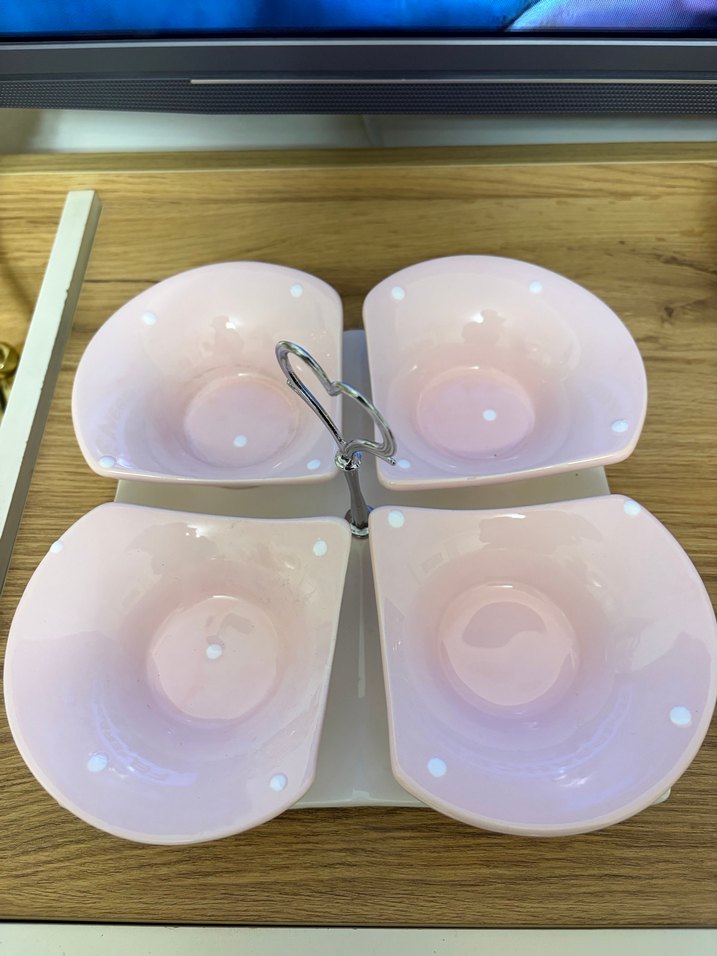Pastel pembe renkte, beyaz puantiyeli modern tasarımlı dört kase, ortasında metal saplı beyaz servis tepsisinde sunulur. ️