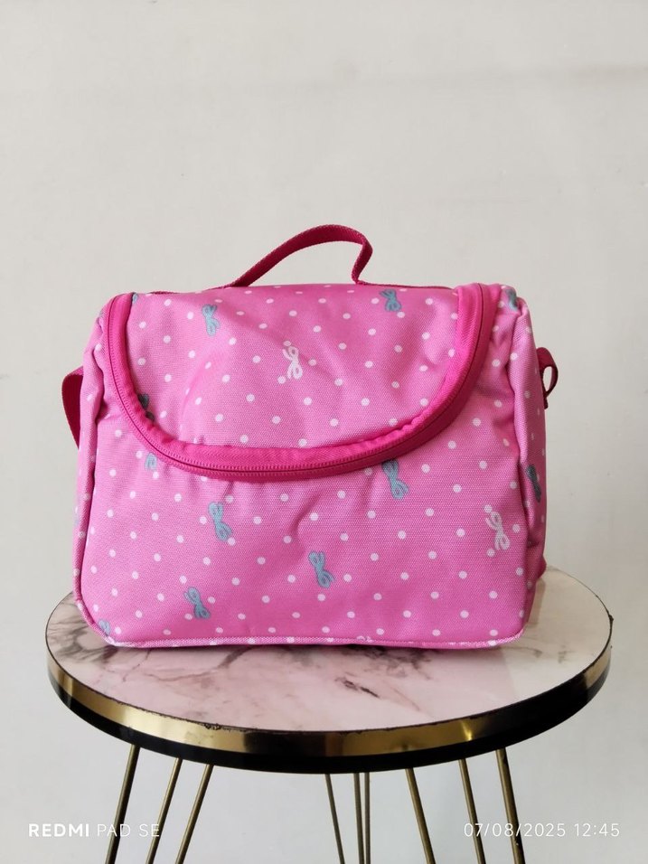Pembe puantiyeli ve renkli fiyonk desenli, üstten tutma saplı ve fermuarlı çocuk okul çantasıdır. Termo beslenme çantası