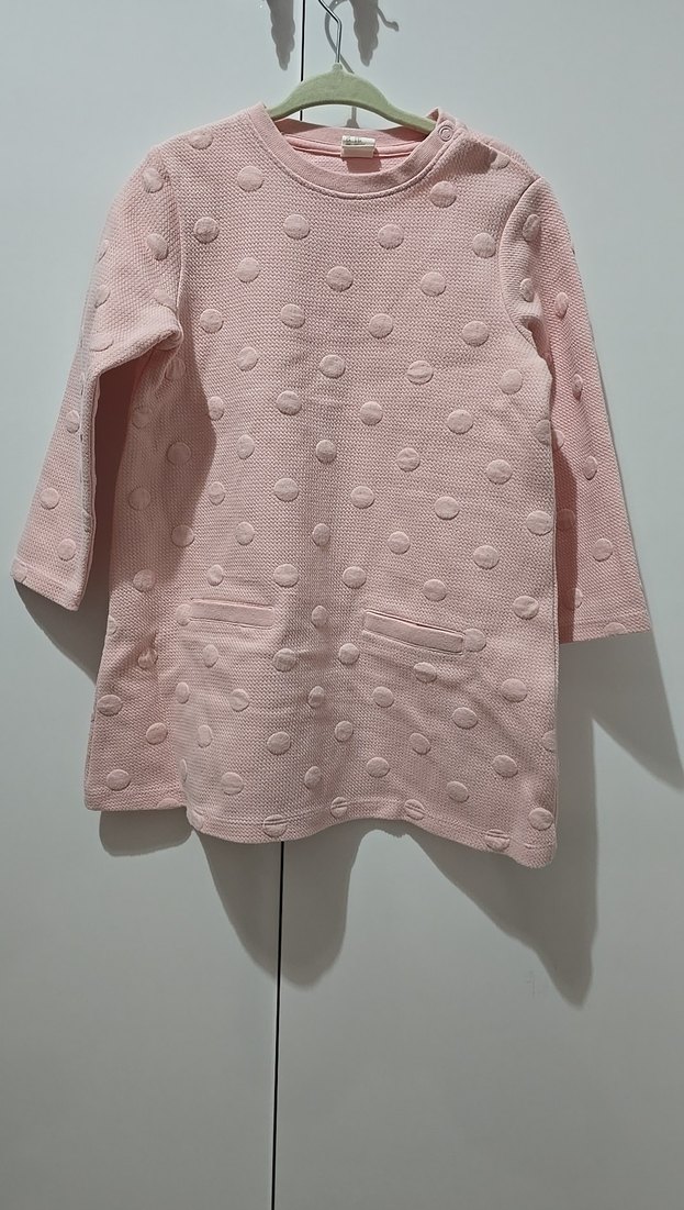 Pastel pembe, uzun kollu, düğmeli ve yuvarlak yaka kız elbisesi. Polka dot desenli, gevşek kesim ve yumuşak kumaştan yapılmıştır.