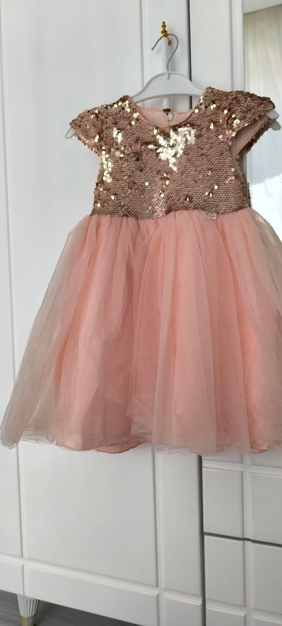 Pullu işlemeli parlak üst kısmı ve yumuşak kat kat etek kısmı ile pembe, askılı, v yaka kesim kız çocuk elbisesi. Bohem tarzda şık bir görünüm sunar. 1 defa kullanıldı.