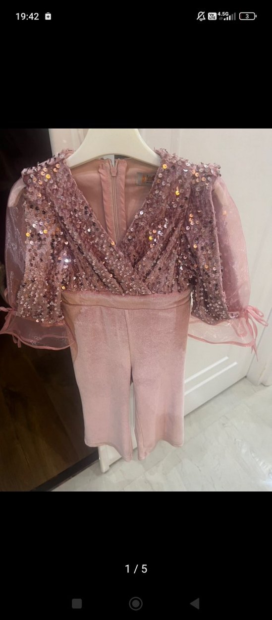 Pembe renkli, pul payetli ve nakışlı detaylara sahip, yumuşak dokulu bebek tulum abiye. çok farklı ve havalı bir abiye ✨
