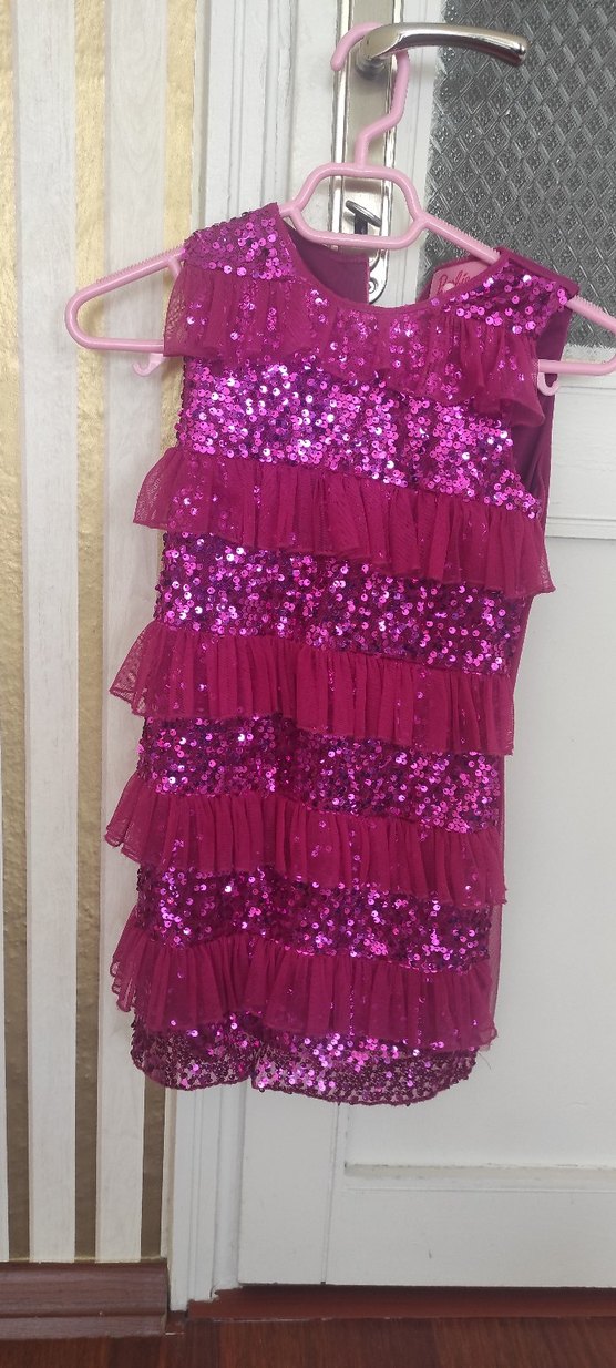 Parlak pembe pul payetler ve kat kat fırfırlarla süslenmiş, straplez yakalı ve ince askılı, sentetik kumaştan yapılmış vücuda oturan kız elbisesi. ✨