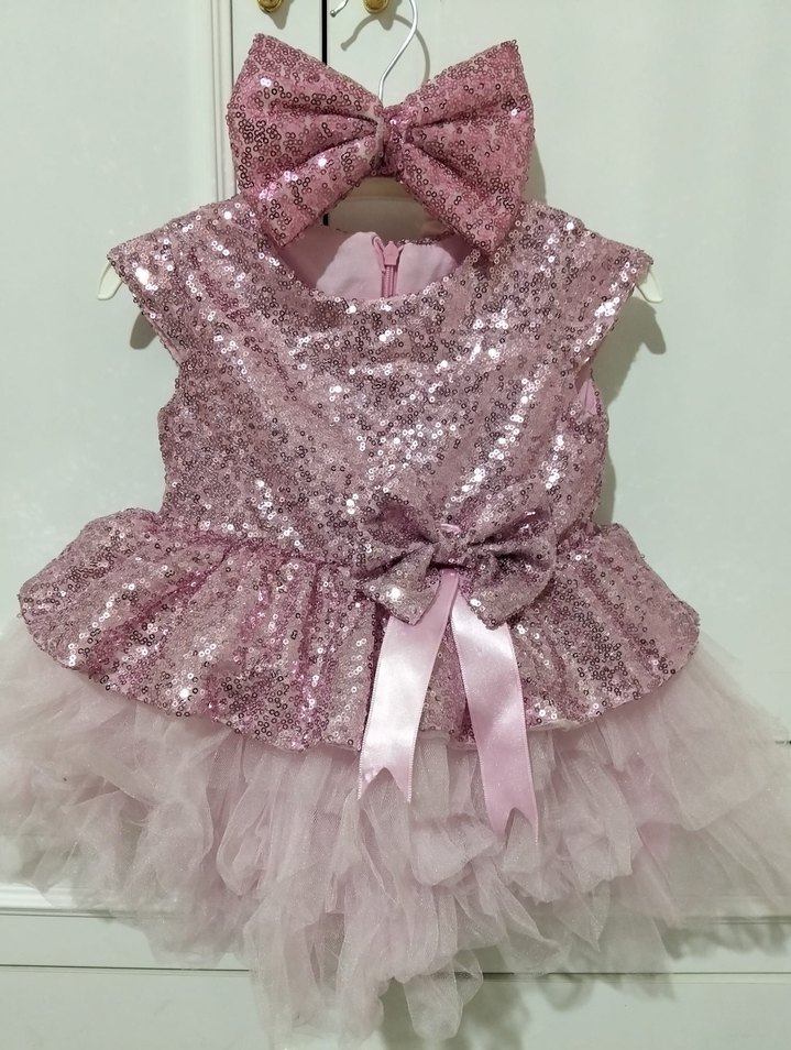 Pembe pul payetli, kolsuz, bele oturan kız çocuk elbisesi, fırfırlı katmanlar ve uyumlu fiyonk detayına sahiptir.