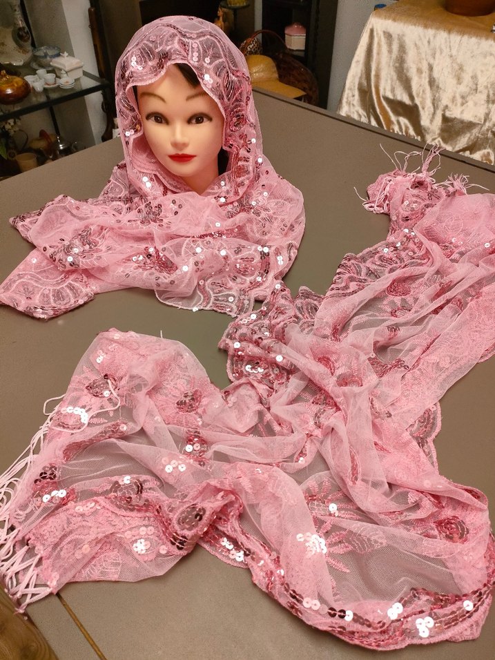Pembe renkli, ince sentetik kumaş üzerine işlenmiş dantel ve payet detaylarıyla bohem ve retro tarzda kadın şalı. Fiyata ikisi de dahildir#şal #pulluşal #bohem