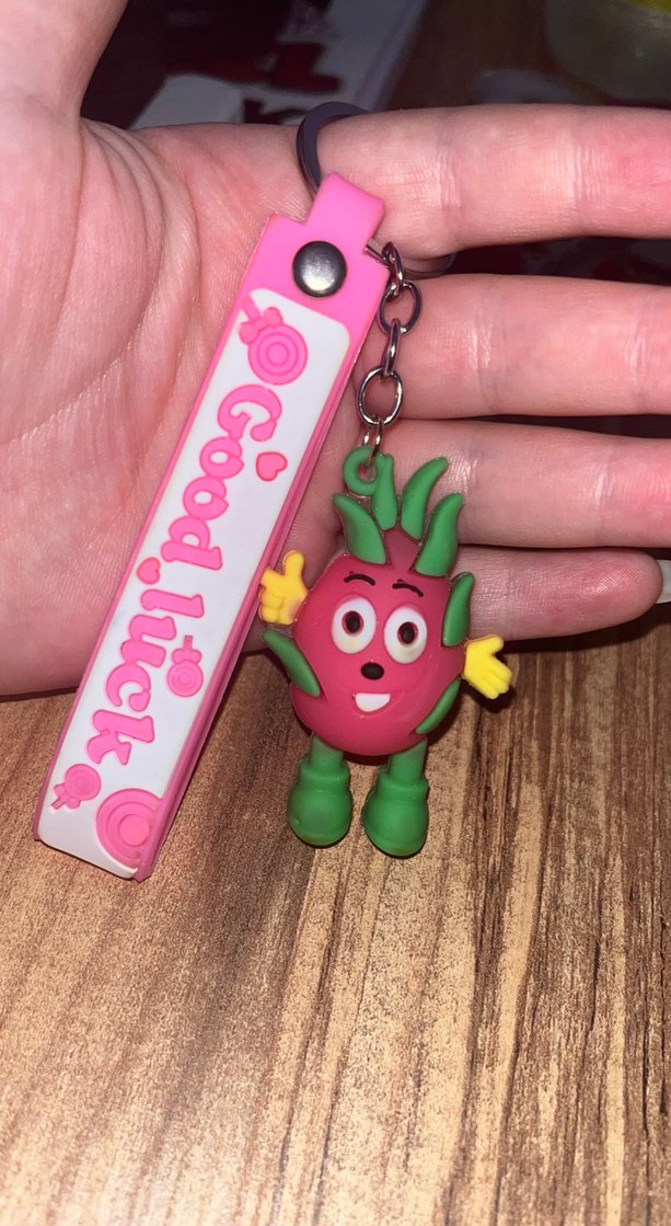 Renkli pembe anahtarlık, 'Good luck' yazılı püskül ve eğlenceli karakter figürüyle rahat rock punk havası katıyor.