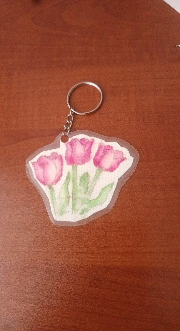 Pastel pembe renkte, püsküllü ve çiçek desenli bohem tarzı anahtarlık.El yapımıdır minik hediyede ekliyorum