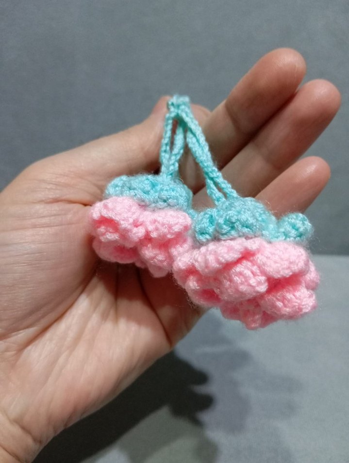 Pembe pastel renkte, püsküllü bohem kadın anahtarlık. Sıcacık ve retro örgü çiçek tasarımına sahip, hippie tarzına uygun.