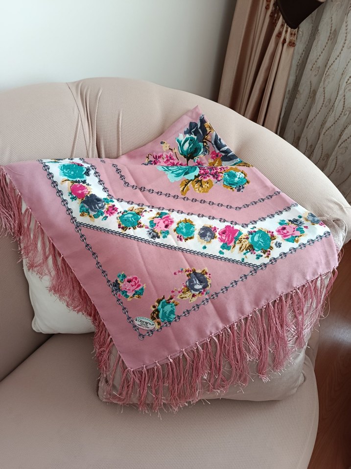 Pembe, pastel çiçek desenli ve püsküllü kenarlara sahip, bohem ve retro tarzda drapeli kadın eşarp