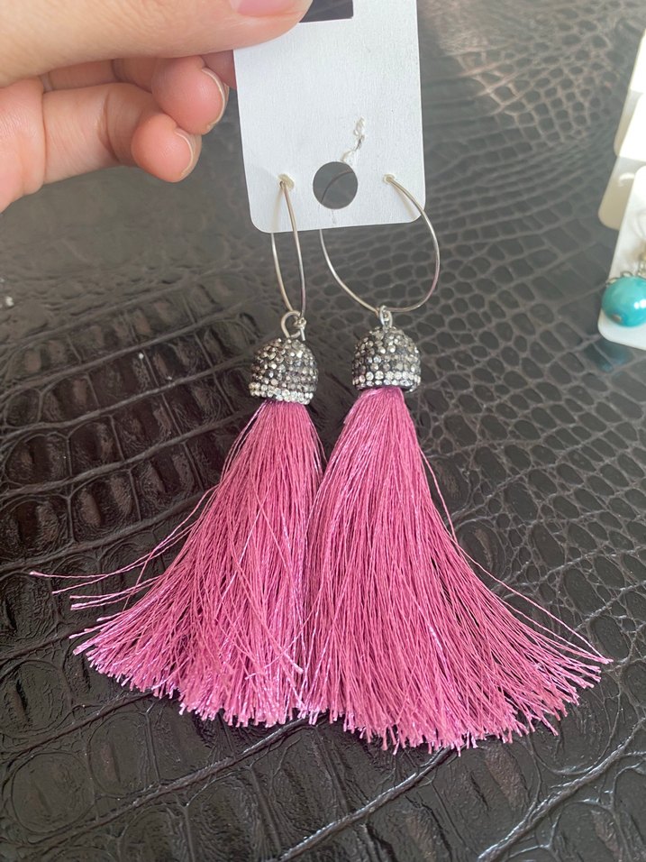 Pembe püsküllü, renkli işlemeli bohem tarzda midi uzunlukta küpeler. Günlük kullanıma uygundur.