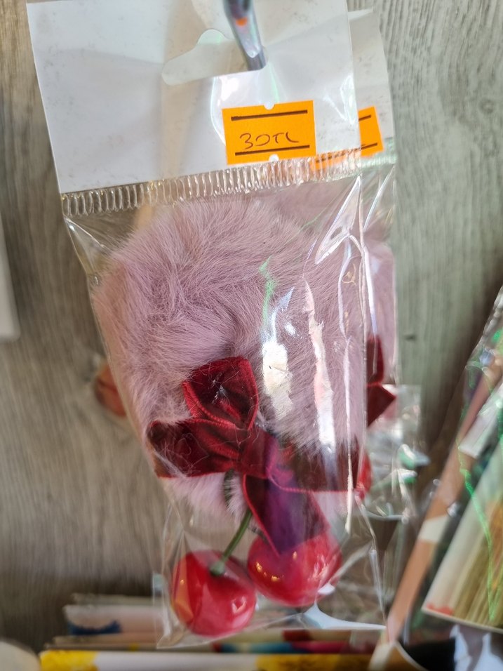 Püsküllü ve kiraz detaylı, yumuşak pastel tonlarda pembe çocuk saç tokası. Baskılı deseniyle şık bir seçenek.
