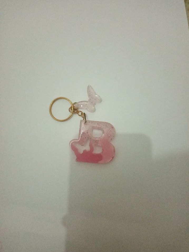 Pembe 'B' harfi, küçük kelebek ve renkli püskülüyle kadın anahtarlığı, minimalist ve bohem tarzı bir arada sunar. ️