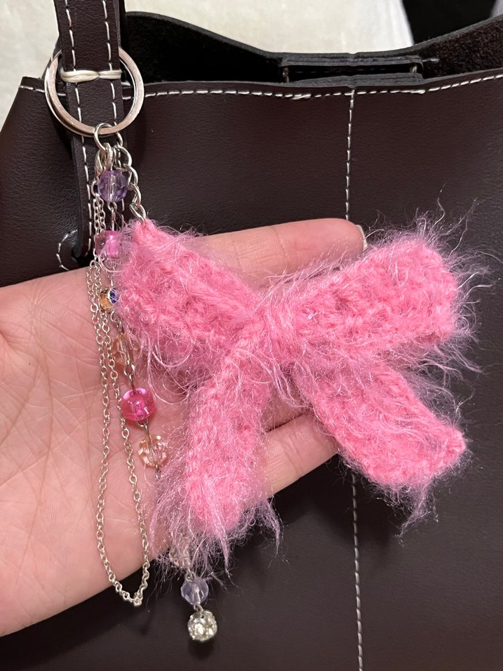 Bu pembe anahtarlık, yumuşak ve tüylü bir fiyonk, püsküller ve süslü boncuklarla aksesuarlarınıza rahat ve şık bir dokunuş katar.