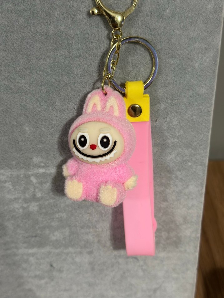 Pembe peluş tavşan figürü ve sarı püsküllü kayışlı renkli anahtarlık, rock punk tarzına uygun.