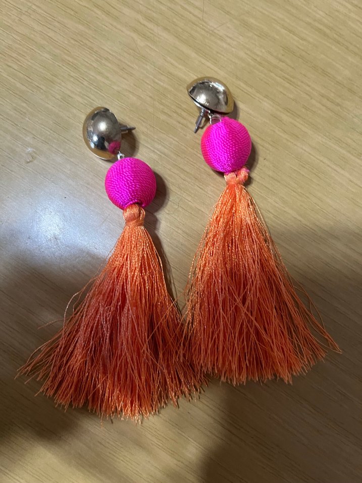 Pembe boncuk ve turuncu püsküllü, renkli tie-dye desenli uzun bohem tarzı küpeler. Parti için uygun.