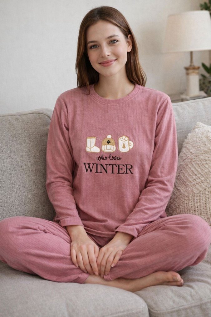 Pembe, uzun kollu, rahat kesim kadın pijama takımı. Baskılı kış temalı desen ve "WINTER" yazısı bulunur. Yumuşak kumaştan, midi boyda. ❄️