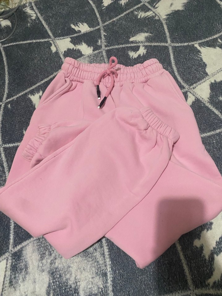 Yumuşak ve sıcak kumaştan, elastik bel ve bağcıklı, rahat kesim pembe kadın eşofman altı. Pastel tonuyla günlük sokak stiline uygun.
