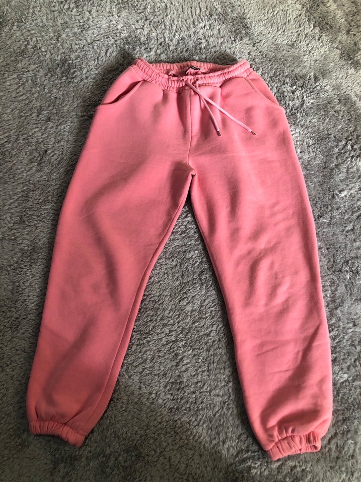 Yumuşak ve sıcak kumaştan yapılmış, normal boy pembe rahat kesim eşofman altı. Günlük kullanım için rahat ve şık. M L XL uyumludur bazı yerinde küçük leke var
