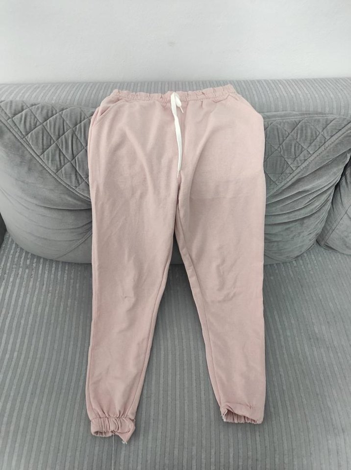 Pembe keten kumaştan, bağcıklı ve lastikli bilek detaylı, rahat kesim kadın eşofmanı. Günlük kullanım için şık ve rahat.
