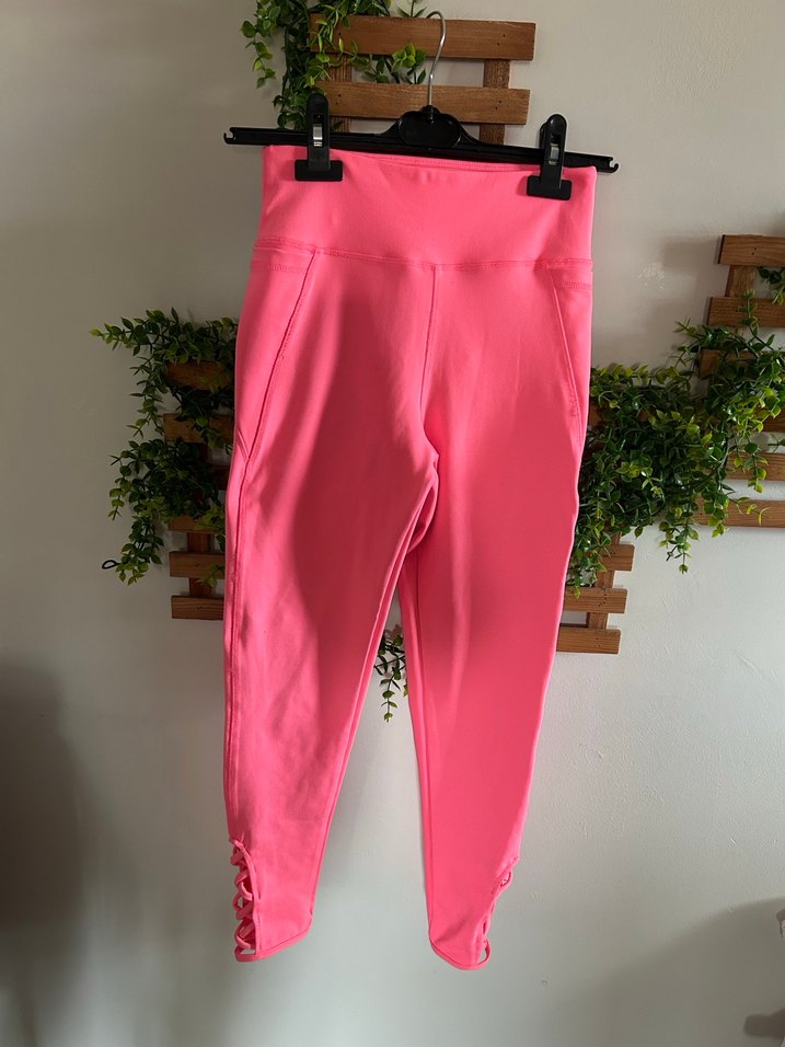 1-2 kere giyildi. sıfır ayarında Pembe renkli, elastik bel bantlı, rahat kesim kadın spor tayt. Renkli ve desensiz, sportif ve günlük sokak stiline uygun.