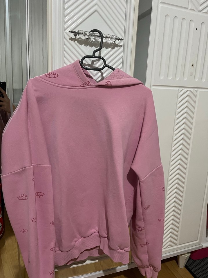 Pastel pembe renkte, rahat kesim, uzun kollu ve yuvarlak yakalı kadın sweatshirtü. Yumuşak ve sıcak kumaştan, günlük rahat kullanım için uygun, kapüşon ve kollarda göz desenleriyle sade ve şık.