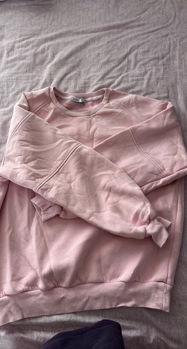 Pembe pastel renkli, yuvarlak yakalı ve uzun kollu kadın sweatshirtü, rahat kesim ve yumuşak keten kumaştan üretilmiştir. Günlük sokak stili için uygundur.