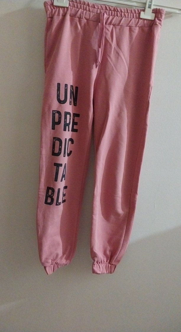 Rahat kesim, midi boy pembe eşofman altı, bacakta 'UNPREDICTABLE' yazısı bulunur. Yumuşak ve sıcak kumaştan üretilmiştir, günlük kullanım için uygundur.