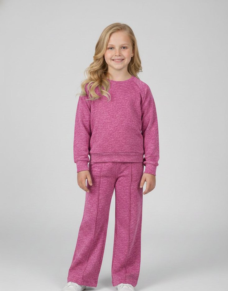 Pembe renkli, bol kesim kız eşofman takımı, yuvarlak yakalı ve uzun kolludur. Yumuşak, sıcak kumaştan yapılmış, sade tasarımla rahat şıklık sunar.