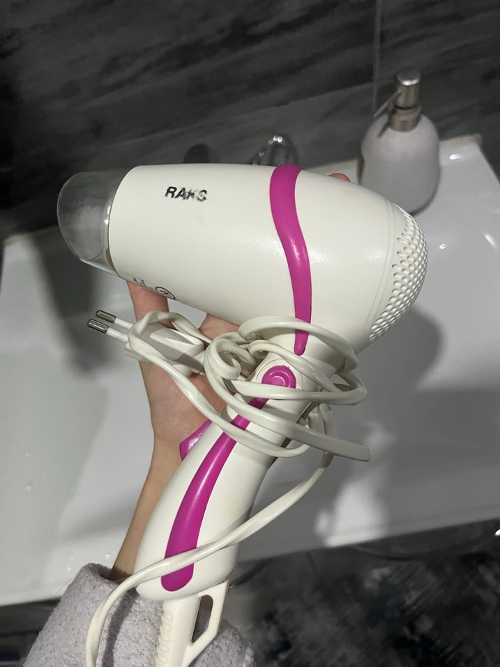 Pastel pembe renkli RANS saç kurutma makinesi, rahat tutuşlu ve ayarlanabilir özelliklere sahip. Güç kablosu ve başlık aparatı bulunur. ♀️katlanılabilir seyahat halinde