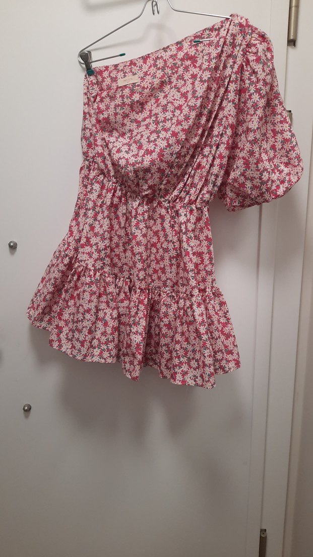 Pembe renkli, tek kollu, Sentetik kumaştan yapılmış, hafif batik desenli ve fırfırlı detaylara sahip bohem tarzda. s beden kemeri de mevcut