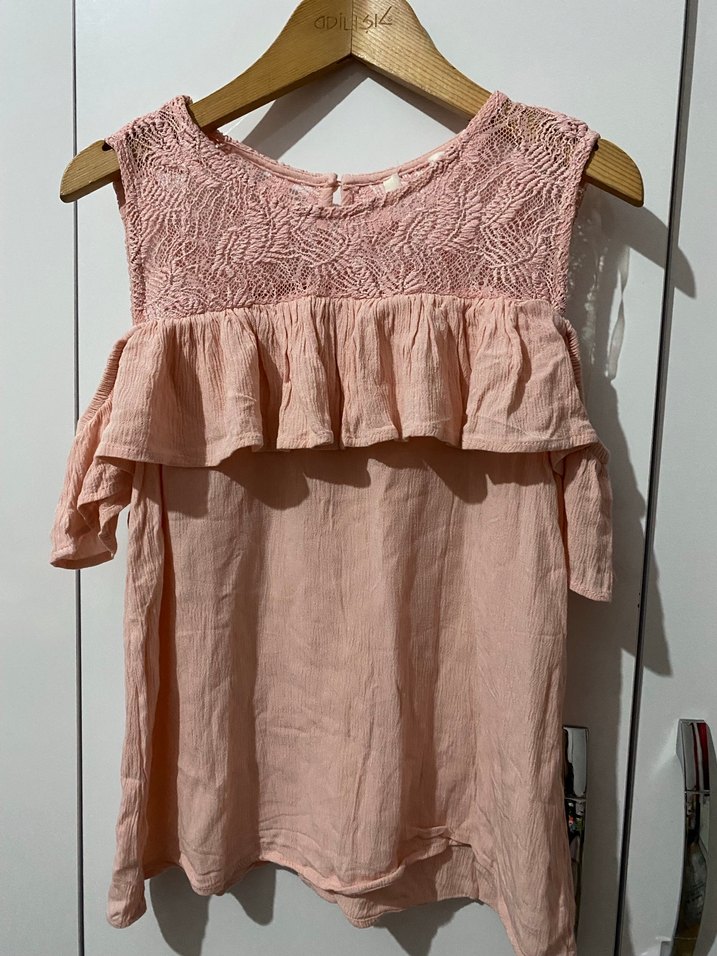 Yumuşak keten pamuklu kumaştan yapılmış, volanlı ve kolsuz, pastel pembe renkli bol kesim kadın bluz. Bohem tarzda, askısız yaka ve midi boyda, günlük kullanıma uygun.