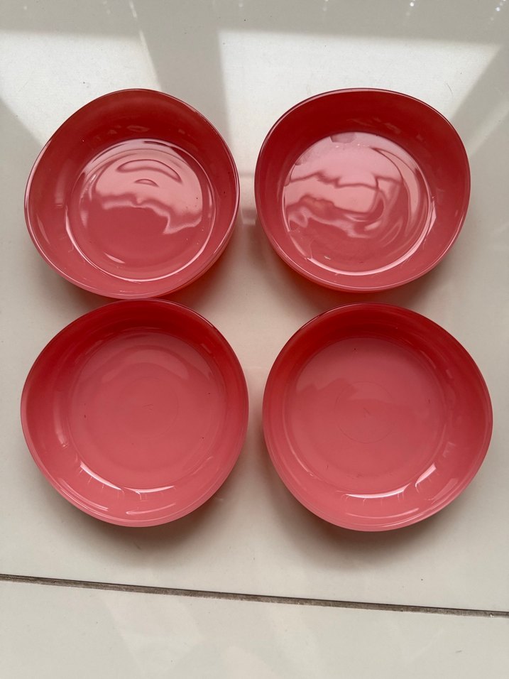 Dört adet pembe, desensiz ve parlak yüzeyli tabak seti