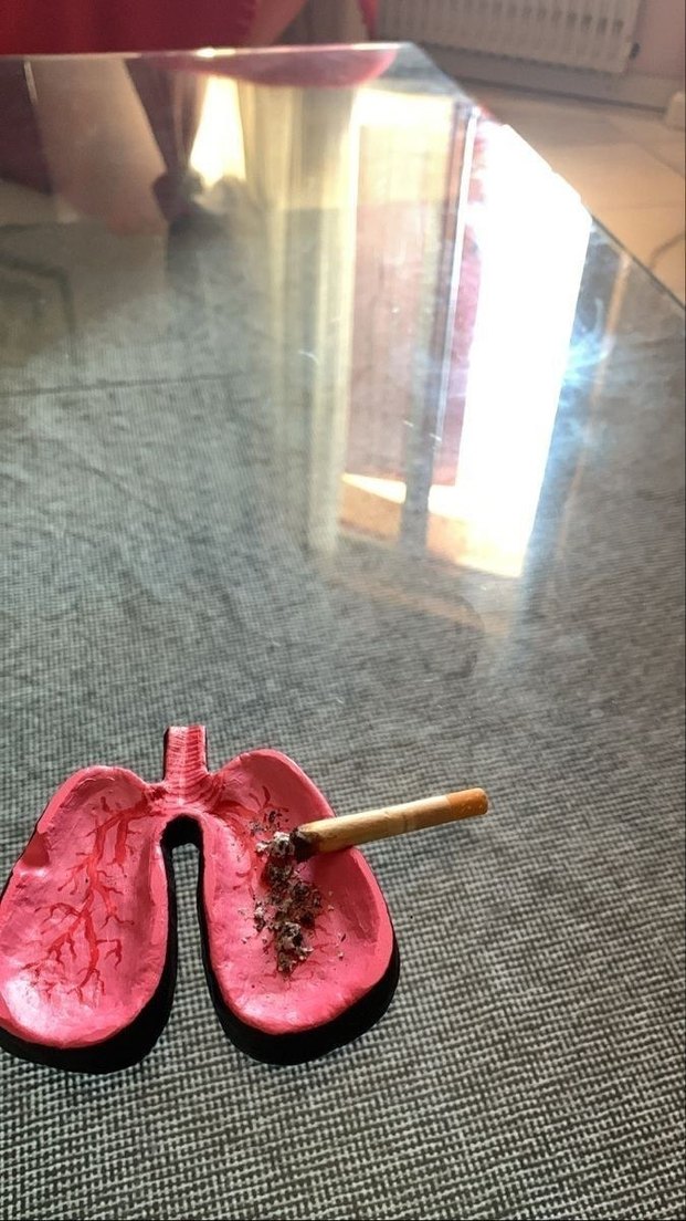 Canlı pembe renkte, damar detaylı akciğer şeklinde bir figürin. Küllük olarak kullanılır, sigaranın etkilerini hatırlatır.