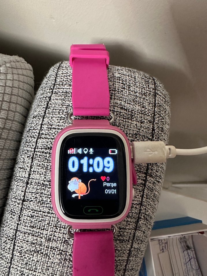 Pembe renkli kayışa sahip akıllı saat, ekranında saat ve tarih bilgilerini renkli ikonlarla gösterir. USB ile şarj edilir. ⌚