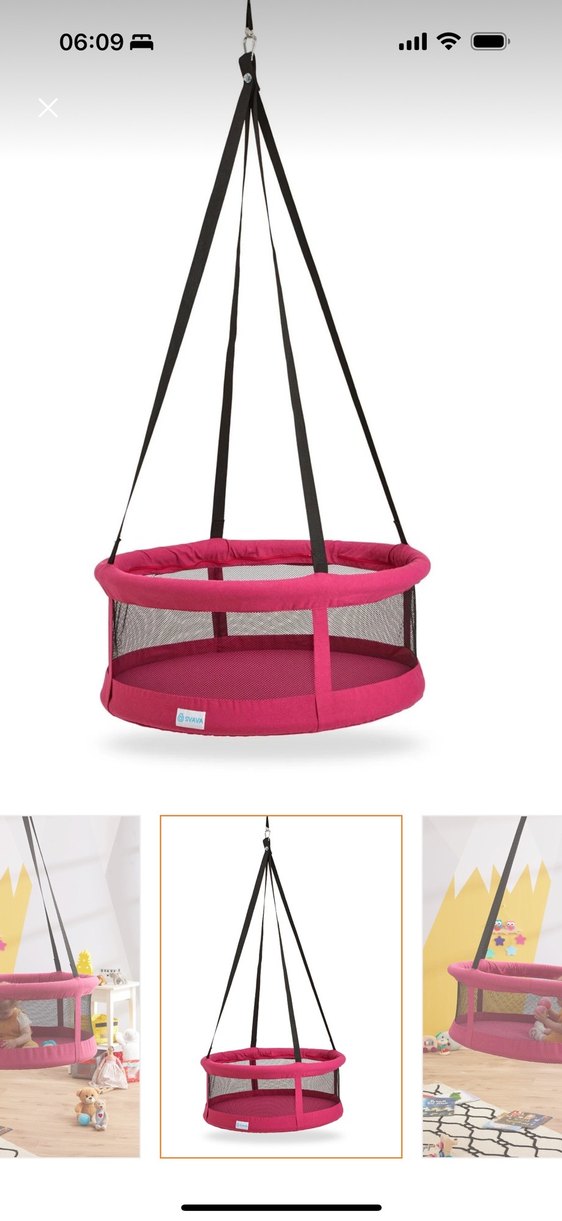 Pembe renkli, yuvarlak şekilli askılı sepette file yan paneller ve ayarlanabilir siyah kayışlar bulunur. Nazik sallanma için uygundur. Az kullanılmıştır.