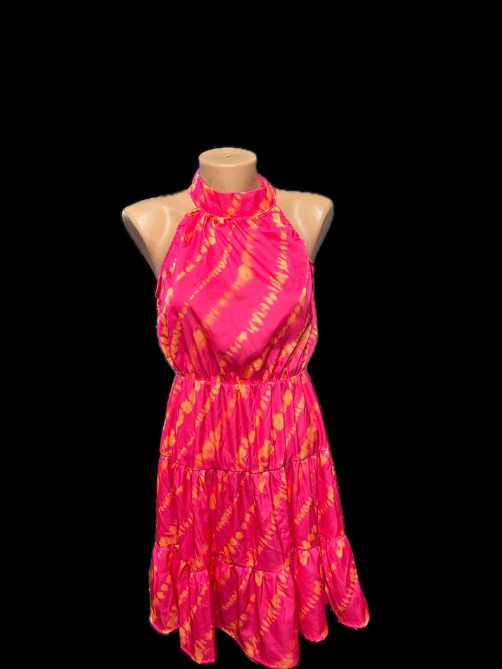 Pembe renkli bağlama desenli, kolsuz, yüksek yakalı ve fırfırlı uzun elbise. İpek gibi kumaştan, bol kesim, bohem tarzda romantik akşamlar için uygun.