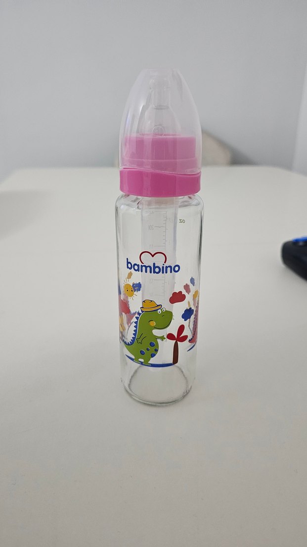 Pembe renkli ve renkli desenlere sahip bambino marka bebek biberonu, üzerinde sevimli dinozor ve çiçek figürleri bulunur.