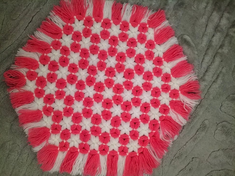 Pembe ve beyaz renklerde, püsküllü kenarları olan renkli örme banyo lifi, yumuşak dokulu.